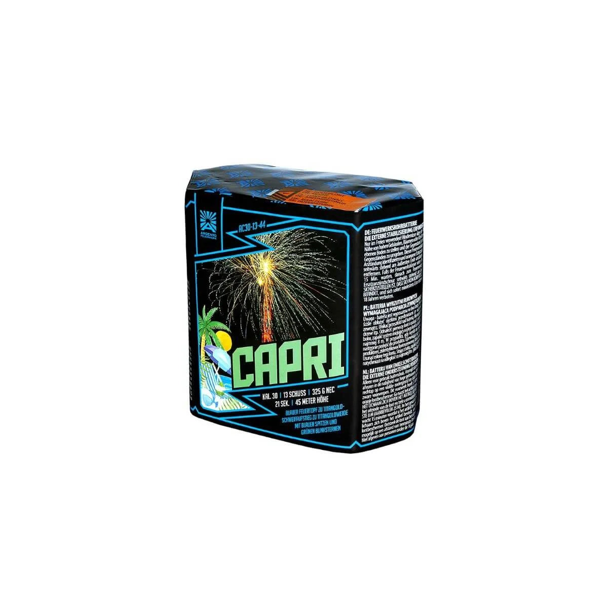 Kaliber 30 mm · 13 Schuss · NEM ca. 325 g · Brenndauer ca. 21 Sekunden · Effekthöhe bis ca. 45 m · Kategorie F2 – ab 18 Jahren, Silvester frei verkäuflich · Gefahrgutklasse 1.4G