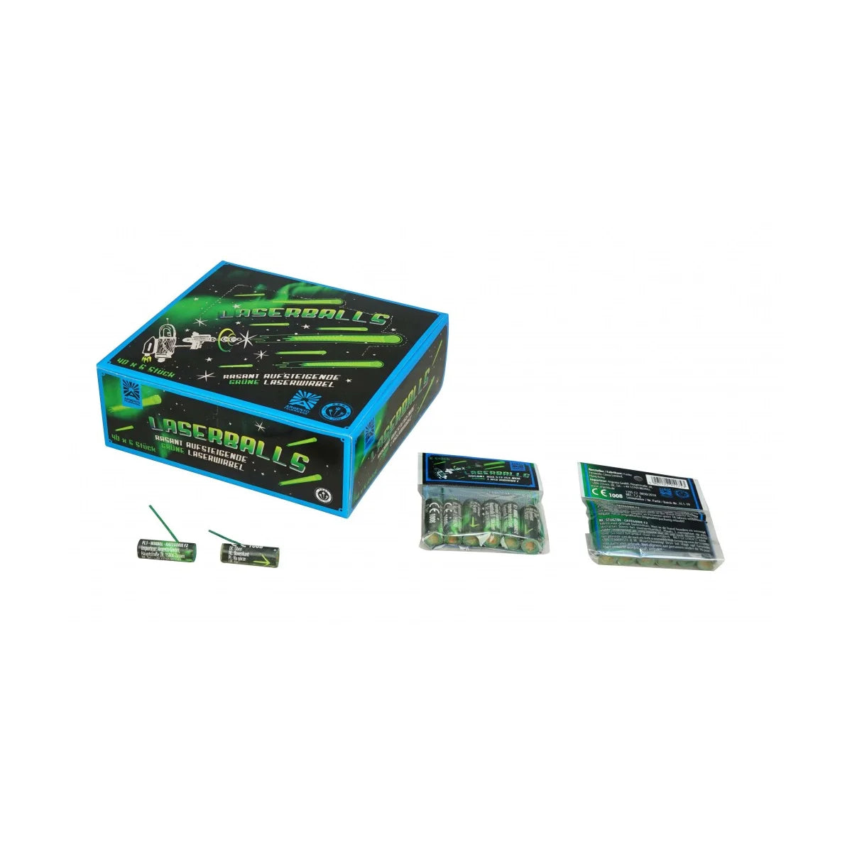 Anzünden – und sofort schießt der Ball mit einem hellgrünen, laserartigen Schweif spiralförmig in die Höhe. Begleitet wird das Ganze von einem schnellen, schrillen Heulton, typisch für Aufstiegswirbel. Kein Zerleger, kein Crackling – der Effekt ist der rasante grüne „Laser-Flug“ selbst.
