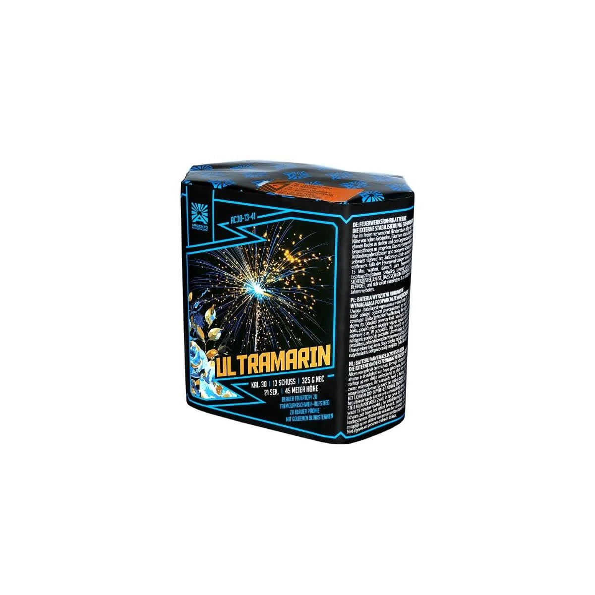 13 Schuss, Kaliber 30 mm, NEM ca. 325 g, Brenndauer ca. 21 Sekunden, Effekthöhe ca. 40–45 m. Kategorie F2 – ab 18 Jahren, Silvester frei verkäuflich.
