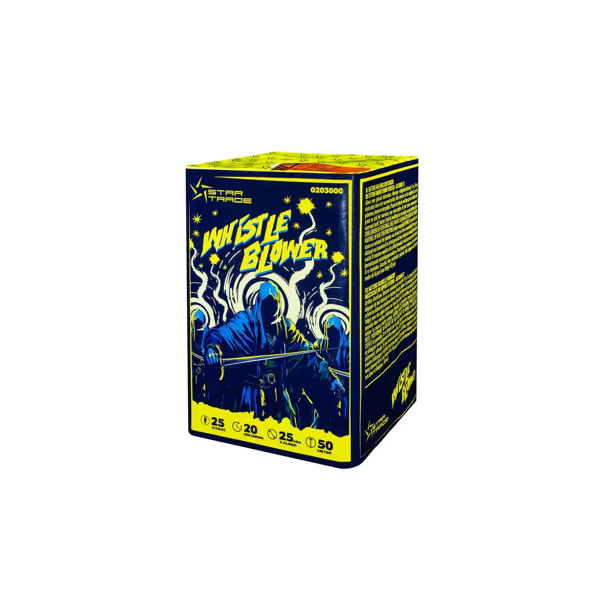 schrille Pfeifkometen schießen zügig in den Himmel, teils mit bunten Leuchtspitzen, teils mit Crackling- oder Blinkfinale. Durch das hohe Abschusstempo entsteht ein durchgehender Soundteppich aus Heulern, kombiniert mit kompakten, farbigen Effekten am Zenit – ideal als eigener „Lärmbock“ oder als Kontrastblock zwischen ruhigeren Goldbatterien.